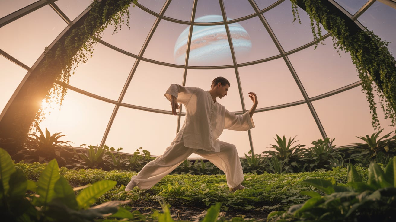 This image captures the essence of living well in a future shaped by stars and silence. Within a dome of life, a single figure moves with purpose—rooted in ritual, surrounded by growth, and watched over by the vastness of Jupiter. It reminds us that even in the furthest reaches of space, wellness begins with balance, intention, and connection to something greater than ourselves.
